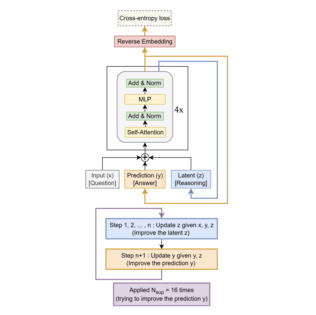 - Deep supervision through recursion: The iterative think-act cycle is unrolled up to 16 times during training, with deep supervision applied at each step. A learned halting mechanism guides the recursion, while at inference time the full unroll is executed. Information flows continuously through the latent states y and z across iterations.