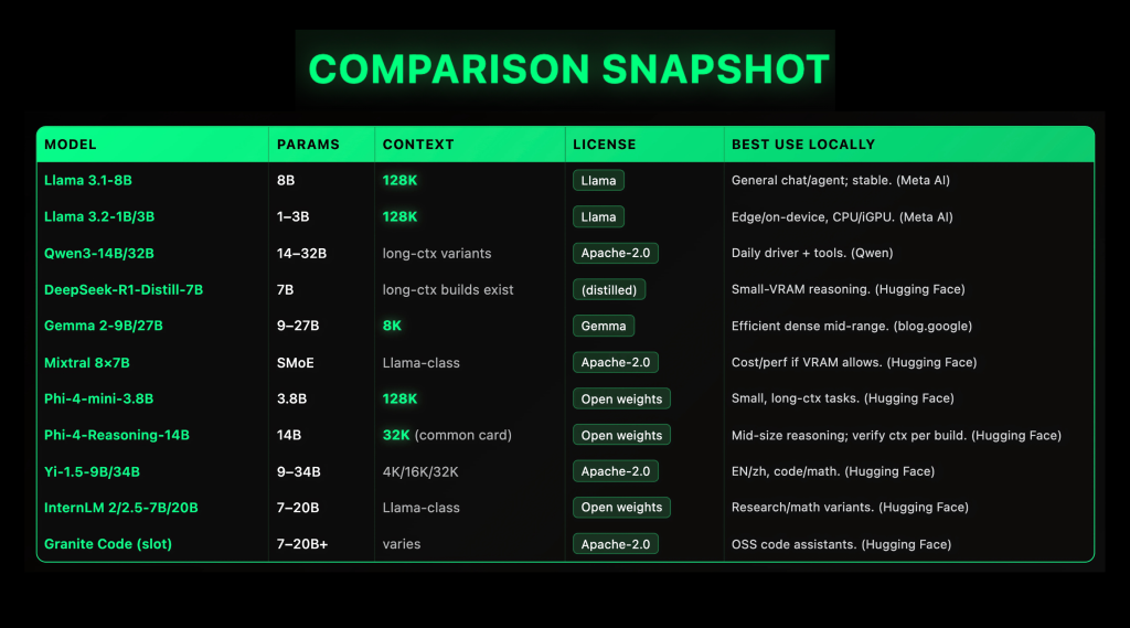 Local LLMs matured fast in 2025: open-weight families like Llama 3.1 (128K context length (ctx)), Qwen3 (Apache-2.0, dense + MoE), Gemma 2 (9B/27B, 8K ctx), Mixtral 8×7B (Apache-2.0 SMoE), and Phi-4-mini (3.8B, 128K ctx) now ship reliable specs and first-class local runners (GGUF/llama.cpp, LM Studio, Ollama), making on-prem and even laptop inference practical if you match context length and quantization to VRAM. This guide lists the ten most deployable options by license clarity, stable GGUF availability, and reproducible performance characteristics (params, context length (ctx), quant presets).
