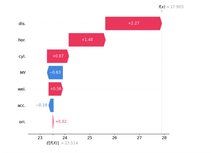 From the first plot, we can see that the base value is 23.5. Features like Weight, Cylinders, Horsepower, and Displacement have a positive influence on the prediction, pushing it above the baseline. On the other hand, Model Year and Acceleration have a negative impact, pulling the prediction downward.