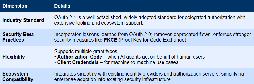 Operating at the transport layer, MCP facilitates secure authorization, enabling clients to access protected servers on behalf of resource owners. OAuth 2.1 was selected as the foundation for MCP due to its contemporary, secure, and standardized approach to authorization management.