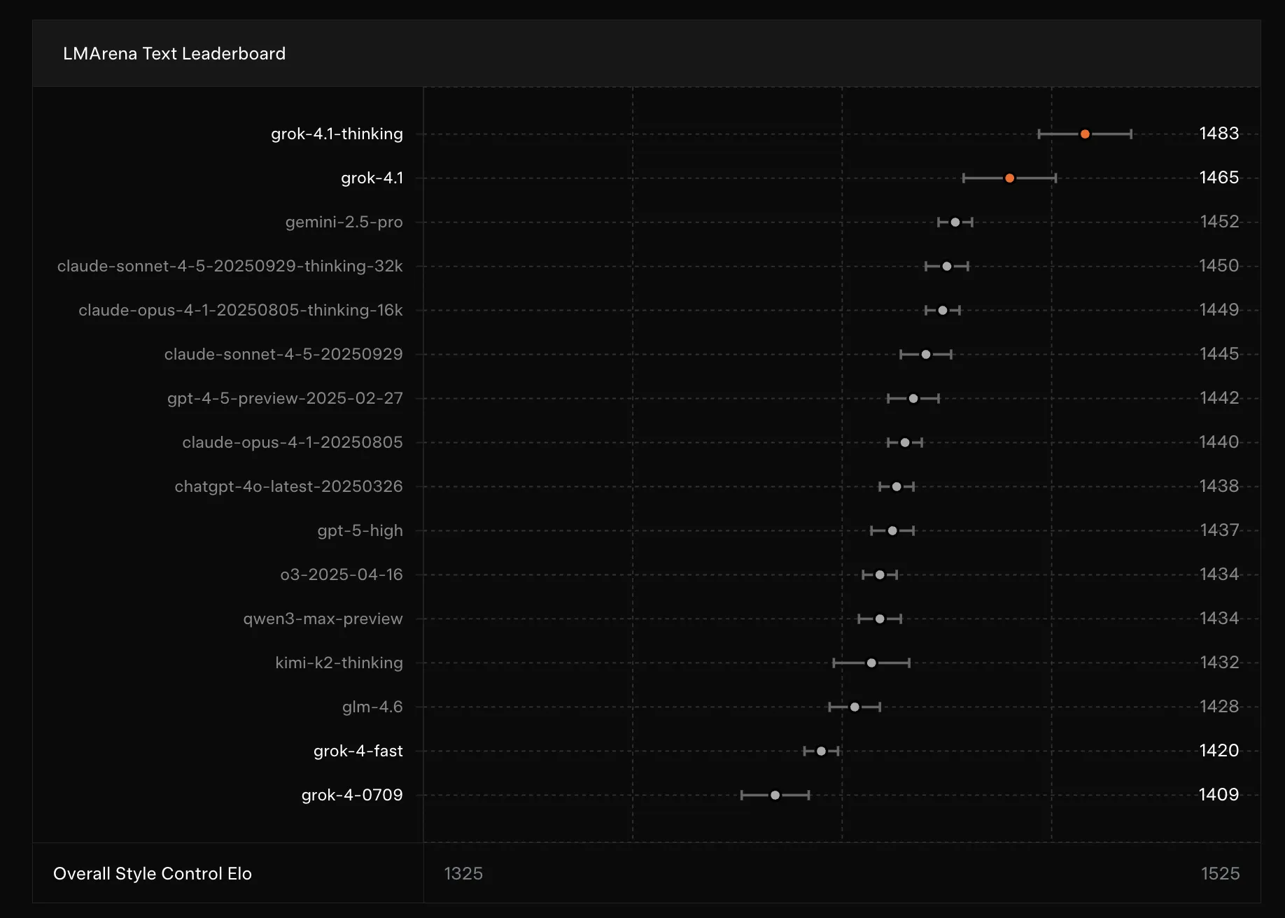 On the LMArena Text Arena leaderboard, Grok 4.1 Thinking currently holds the top spot with an Elo rating of 1483, outperforming the nearest competitor by 31 points. The faster non-reasoning variant ranks second with 1465 Elo, surpassing all other models’ reasoning-enabled versions. This marks a significant leap from the previous Grok 4, which ranked 33rd, highlighting substantial improvements in both user preference and benchmark performance.