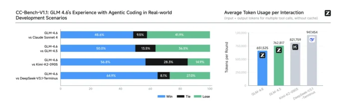- Enhanced Coding Performance: On the comprehensive CC-Bench-a benchmark involving multi-turn coding tasks evaluated by humans in isolated Docker environments-GLM-4.6 achieves a 48.6% win rate against Claude Sonnet 4, demonstrating near-equal proficiency. It also completes tasks using approximately 15% fewer tokens compared to its predecessor, GLM-4.5. Detailed task prompts and agent decision paths are publicly accessible for transparency.