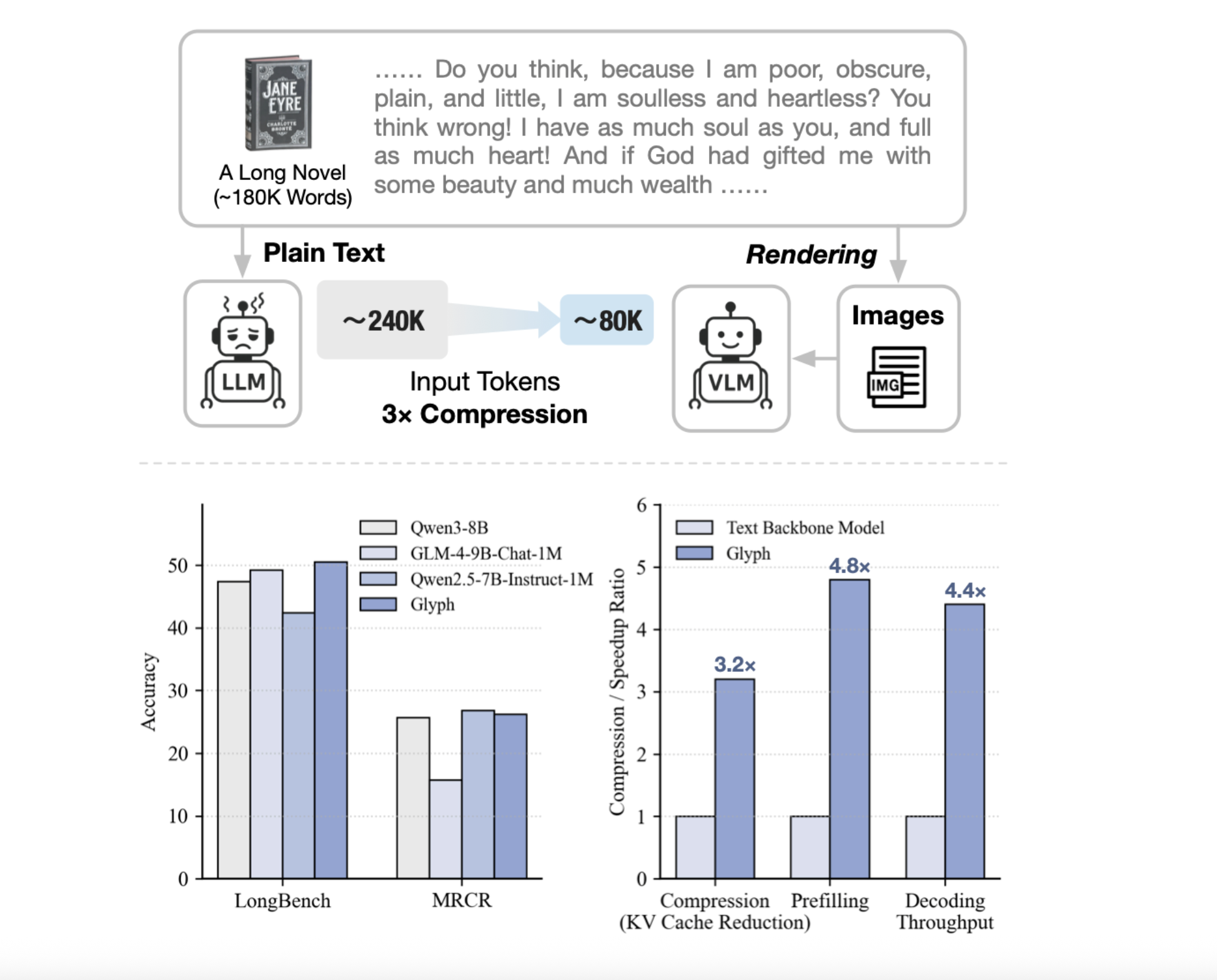 - Glyph renders long text into images, then a vision language model processes those pages. This reframes long-context modeling as a multimodal problem and preserves semantics while reducing tokens.
